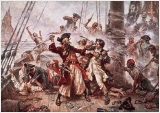 Das Gemälde Die Gefangennahme des Piraten Blackbeard 1718 von J. L. Ferris zeigt den berüchtigten Piraten Edward Teach, genannt Blackbeard, in seinem letzten Gefecht mit den Briten. Blackbeard überfiel immer wieder die Küsten Nordamerikas und der Westindischen Inseln und teilte seine Beute manchmal sogar mit dem Gouverneur von North Carolina. Schließlich stellten ihn Schiffe aus Virginia in einer Bucht vor North Carolina. Blackbeard starb im Kampf mit dem britischen Kommandeur; sein abgeschlagenes Haupt wurde am Bugspriet seines Schiffes zur Schau gestellt.
