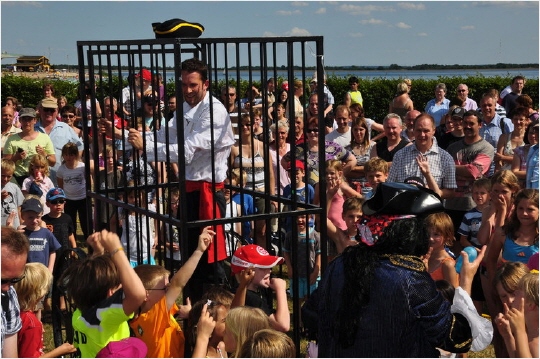 Im sogenannte "Galgenwagen" können unsere Piraten bei Wasser und Brot eingesperrt werden. Vielleicht haben sie den Kapitän bestohlen, eine der Piratenregeln nicht beachtet, die Schatzkarte entwendet oder das Versteck der Schatzinsel verraten.