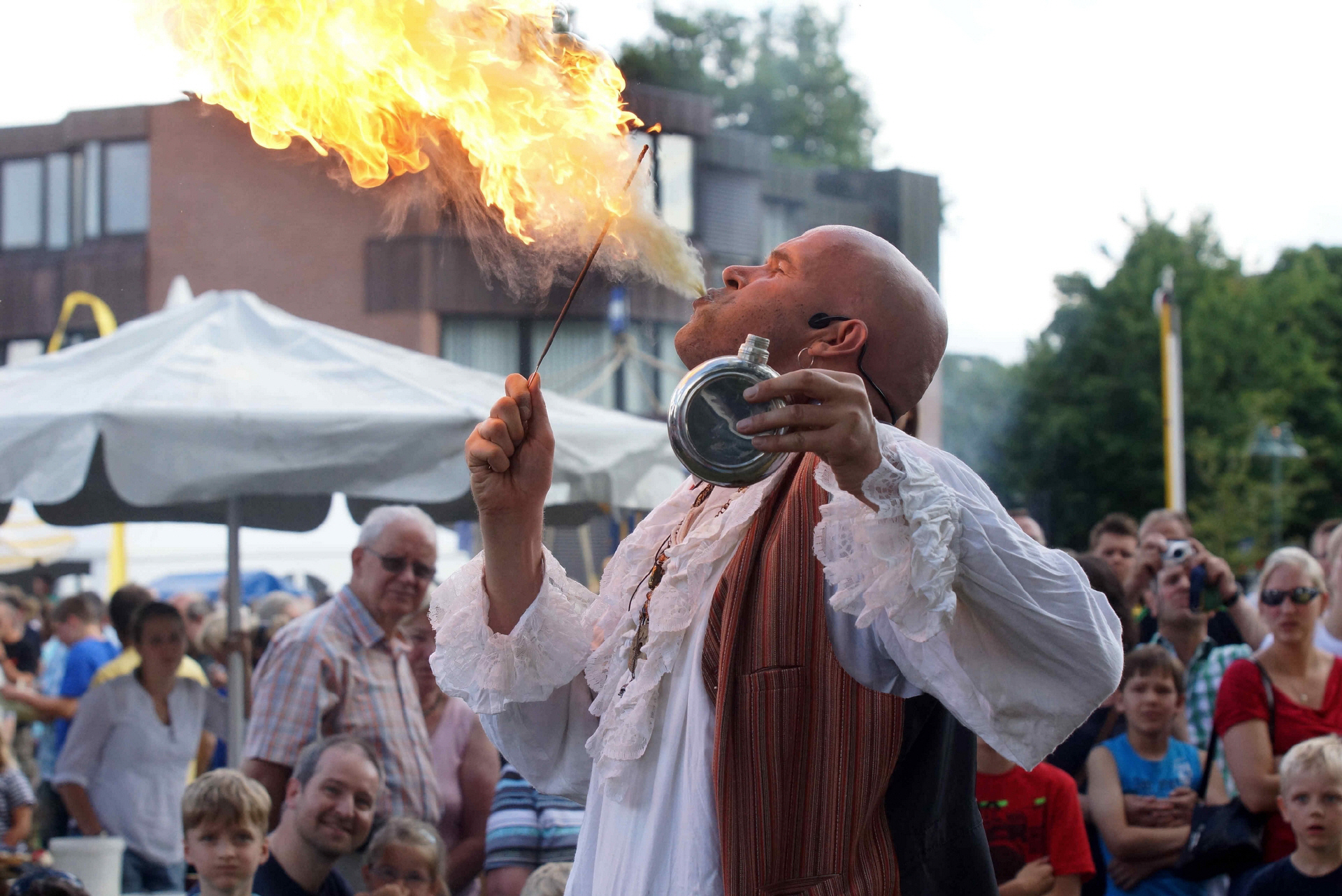 Eine feurige Mischung aus Jonglage mit brennenden Fackeln, Feuerspucken- und Feuerschlucken, Feuerschlucken. Matrose Hein und sein Käpt’n perfektionieren die Methoden des Schangha… äh …des Heuerns einer neuen Besatzung.